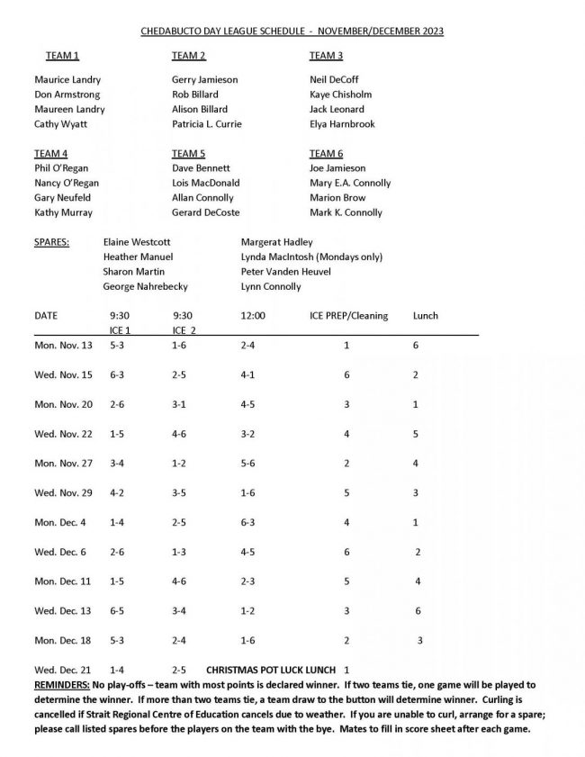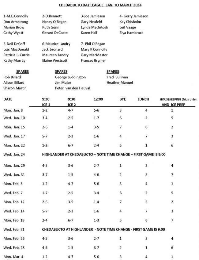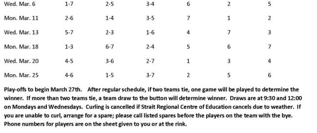 As of Mar. 25th the second Half Day league is complete. First place was Team Landry with 23pts, tied for 2nd place was Team G. Jamieson and Team O’Regan with 21pts each, and 4th place was Team DeCoff with 17pts. A tiebreaker game to decide 2nd and 3rd place will be played on Wed. Mar. 27th at 9:30am